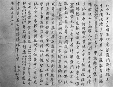 仁师接尊函,朗诵一过,笑而置之。人问其故,答曰:此信所诟厉者,与我毫无干涉。何恚之有?复检初次奉答之信稿阅之,不知见怒于台端者,在何语句?信口所答,无非护法深心。师言直起直落,无丝毫委屈,寻常接人,莫不如是。弟相依三载,甘苦同尝,学焉方知不足,外间交游,渐形疏略。招学梵文启,送去多纸,亦无人愿往。传吠檀多教者,纵来此间,弟亦无力接待也。