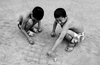 小时候,我们还玩过一种名叫“割韭菜”的游戏。这是从乡村现实中的看护菜地、防人偷菜的生活实景演变来的。