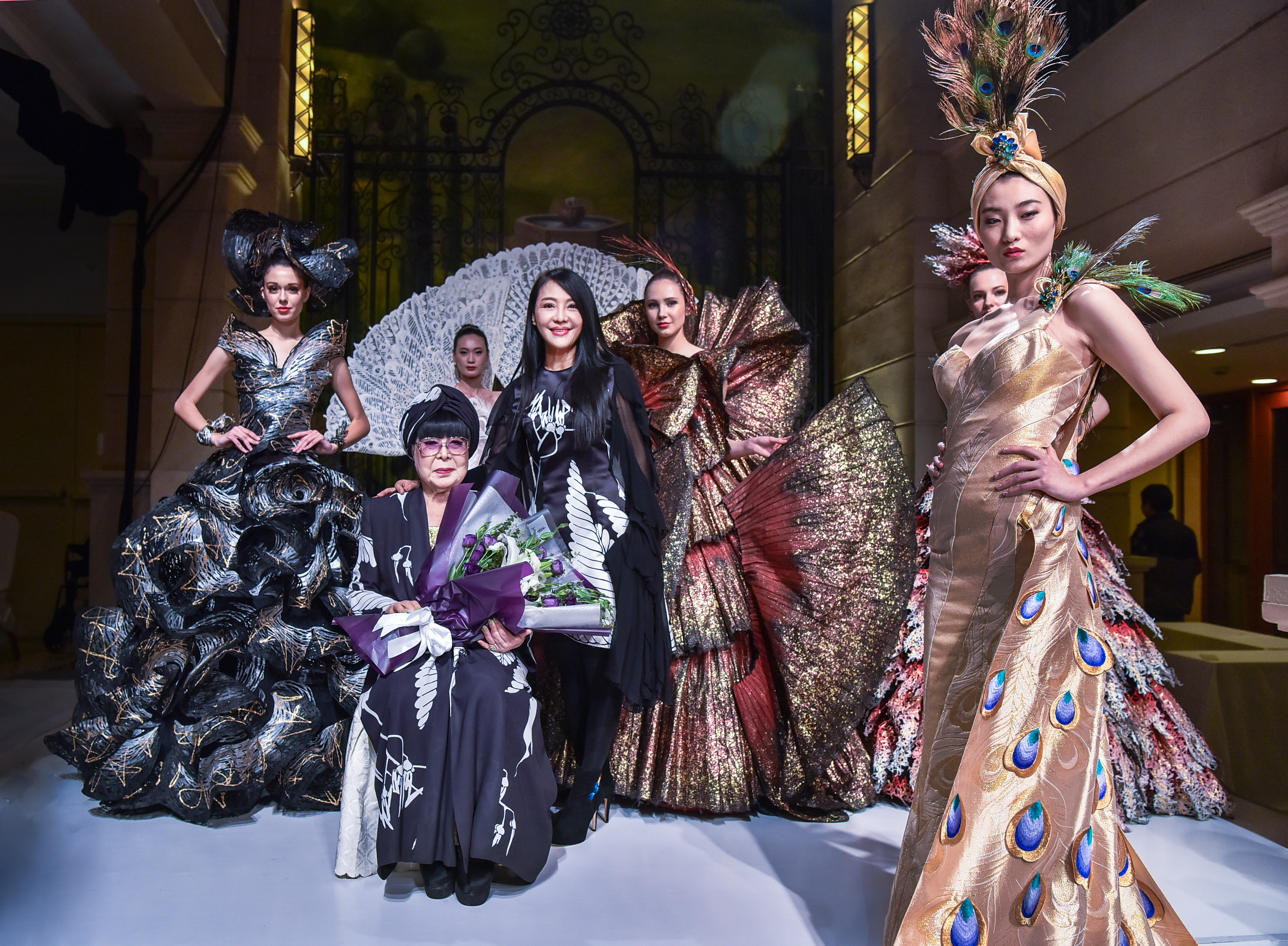 这次上海大秀中特别展出一件纯金丝线制成的礼服,桂由美介绍,这套礼服使用了82万米纯金线,织成的极为纤细的纯金面料,同时用纯金线刺绣了精美的图案,制作工艺令人惊叹。