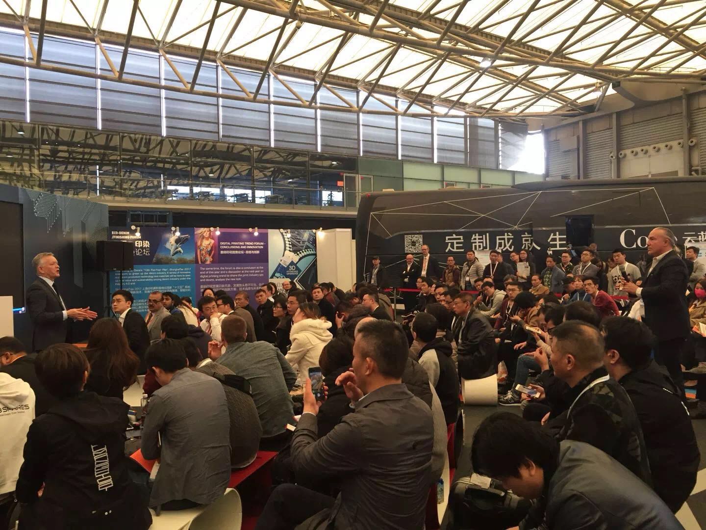 开幕当日下午,“2017上海国际纺织智能制造高峰论坛”在上海东锦江希尔顿逸林酒店举行。论坛以“纺织智能化制造创新发展”为主题,围绕纺织行业智能制造现状与发展趋势、纺织智能制造应用等议题展开。同时,纺织“工业4.0”智造论坛也于开幕当天在E1馆顺利举行,观众与讲者热烈讨论如何利用智能化科技在生产的各个环节进行数据化和智能化逐步提升,适应万变市场。该论坛区还特别设有“智能工厂及C2M体验区”,展示智能纺织技术、3D打印、魔幻大巴3D量身等最新功能性服装技术,现场观众更纷纷走上魔幻大巴亲身体验了3D量身技术,只需数秒时间就可以量度身形尺寸,上载至计算机系统后即可制作一件完美符合身材的衬衫。