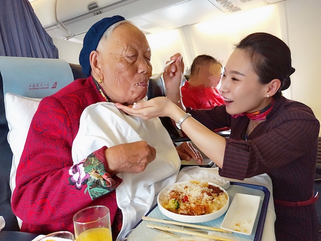 女儿张女士悄悄告诉乘务员,她和母亲之前闹了点小别扭,母亲就像孩子一样赌气,正和她闹脾气;在候机楼等待时,女儿让母亲吃东西,老太太发着脾气坚决不肯吃。张女士担心老人乘机飞行中的身体状况,恳求乘务长和乘务员,希望想想办法劝劝老人,让她吃点东西,“出门已经大半天了,她还没吃过饭。”张女士一脸无奈和担忧,但也提到老太太喜欢和人交流接触。乘务员一口答应下来,“放心,我们一定不让老人饿着下飞机。”