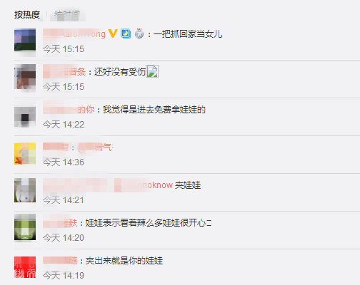 6月20日晚,东莞石龙一商业广场里,一名3岁小女孩钻进娃娃机内,无法出来。接到报警后,民警赶到现场找来商场负责人打开机门,抱出小女孩,救护人员确认小孩没受伤。视频被传到网上后,网友们纷纷猜小女孩是如何钻进娃娃机的,也有网友直接提议把小女孩“夹”出来。民警核实小孩母亲身份,教育家长看管好自己的孩子,之后小孩被其母亲带回。