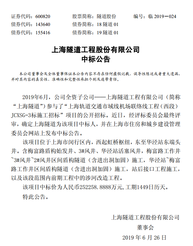 隧道股份昨日发布公告称,公司全资子公司上海隧道参与了“上海轨道交通市域线机场联络线工程(西段)JCXSG-3标施工招标”项目的公开招标。近日确定上海隧道为该项目中标人,中标价为人民币252258.8888万元,工期1449日历天。
