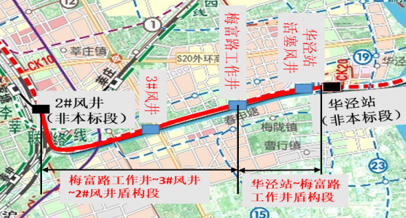 该项目位于上海市闵行区内,西起虹桥枢纽,东至华泾站东端头井。含梅富路盾构始发井、3#风井、华泾站活塞风井,梅富路工作井~3#风井~2#风井区间盾构隧道(含进出洞加固)施工,华泾站~梅富路工作井区间盾构隧道(含进出洞加固)施工,站后接口工程施工,以及该段范围内前期工程中的涉河改造工程。