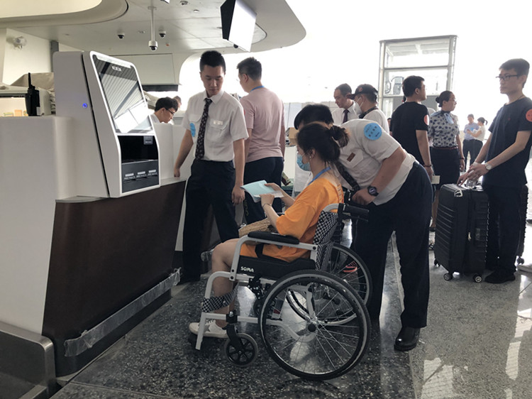 旅客刘小姐来到柜台,需要办理轮椅服务,值机工作人员热情地接待,并有序地进行信息上报、单据填制、特服员安排、旅客轮椅托运及登机口交接等流程。