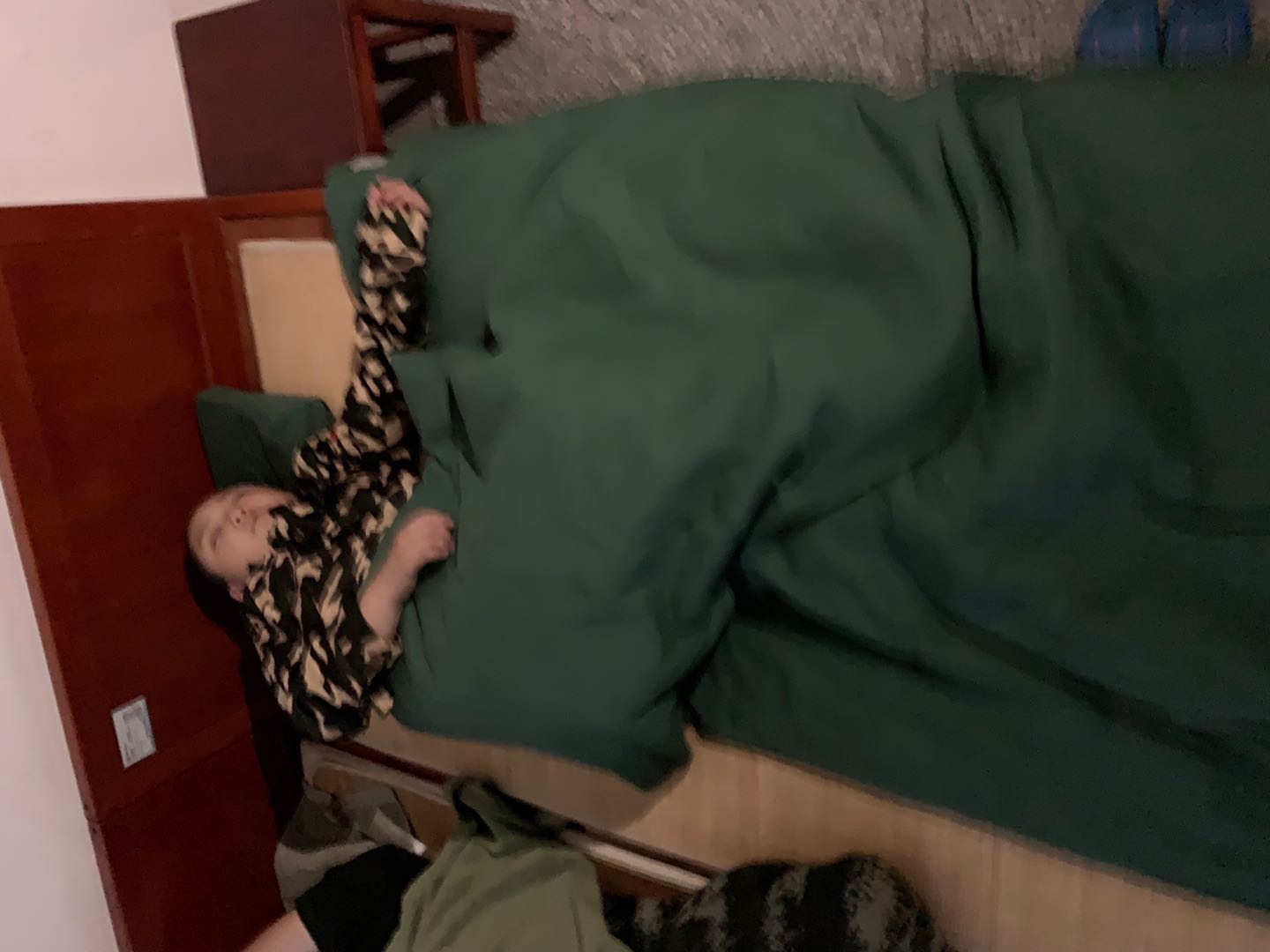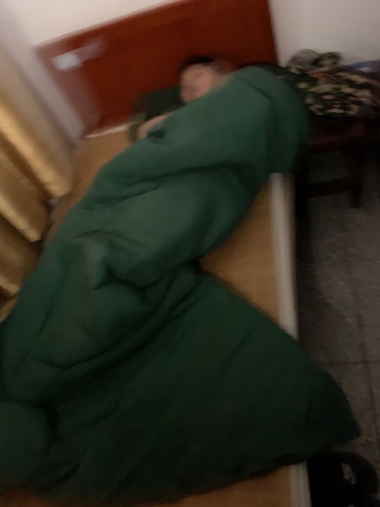 仿佛是害怕明早的内务整理一般,这位淘气的小战士,将被子展开铺在身下。这样早起以后就可以少折几下了吧,他可能心底窃喜着入眠。这样可不行啊,小战士,当心夜晚的冷风“偷袭”你哟。老师们为他轻轻盖上被子,掖平被角,愿他一夜好梦。