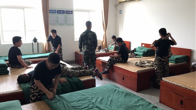 回到宿舍,小战士们分为五个班,分别由教官现场教学演示,如何折叠和摆放方块被与迷彩服,如何收整个人物品。