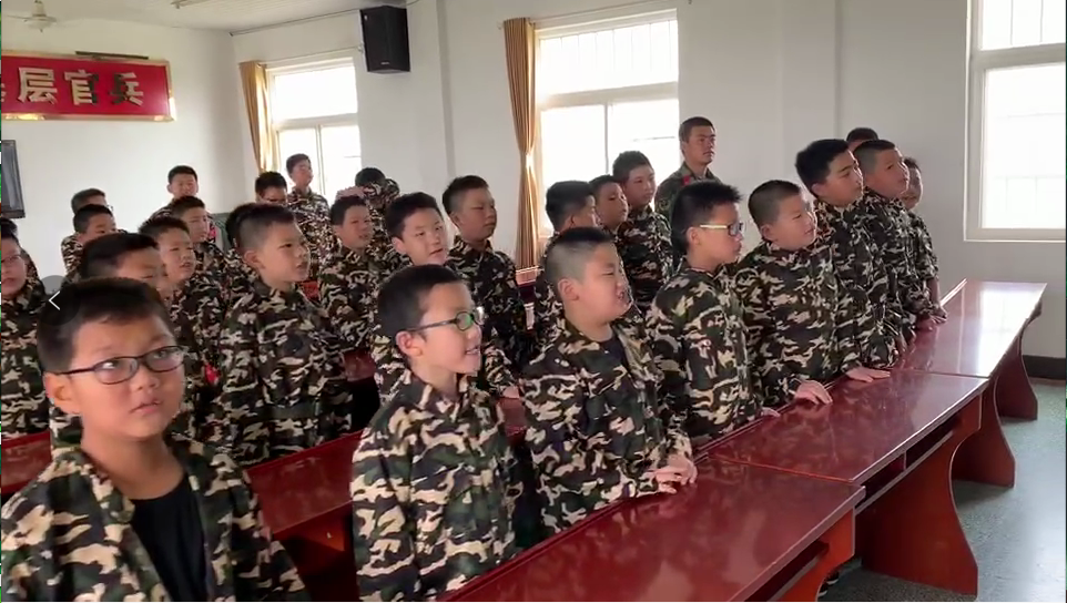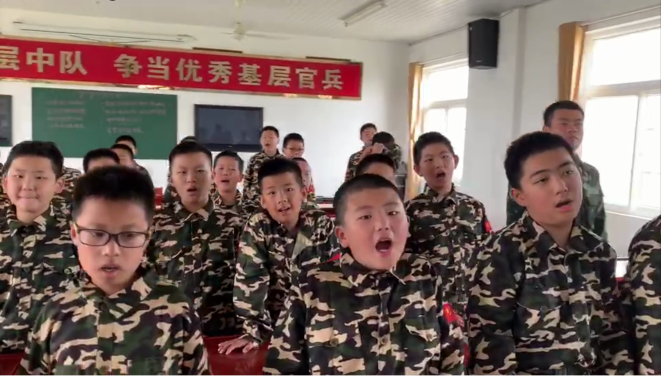 “钢要炼,铁要打,宝剑要磨枪要擦。战士最爱演兵场,汗水浇开英雄花……”随着教官激昂的歌声,小战士们也逐渐情绪高亢,跟着教官开始演唱。