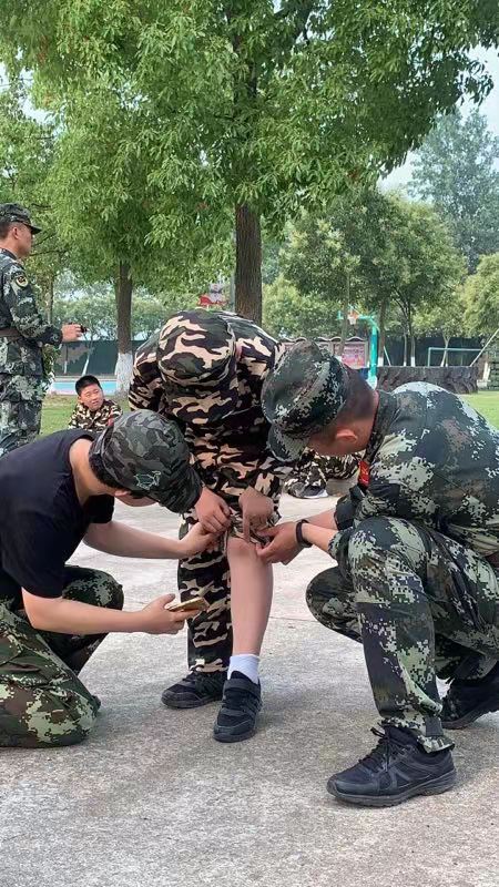 二班小战士胡凯文,在跑步过程中不慎摔倒,裤子擦破一个大洞,膝盖破了皮,但他还是忍着痛,继续坚持后面的训练项目。最后,细心的教官发现了他裤子上的破洞,和老师一起检查他的伤情。