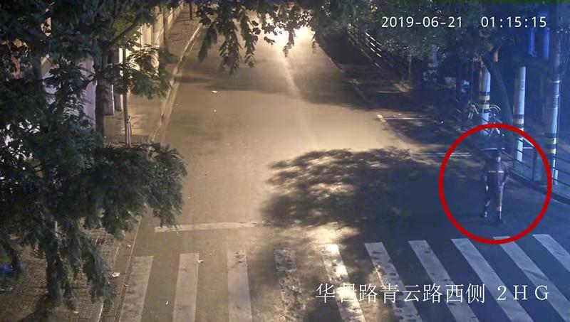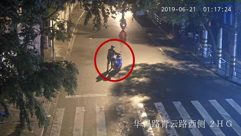 接报后,广中路派出所的民警迅速对案发点和周边地区的视频监控录像进行调阅,并从案发地周边的一处监控中找到蛛丝马迹。在案发前几分钟,一名男子身着一件黑色长袖卫衣,经过小陈停车的路段。并且该男子将卫衣的帽子戴上,遮去了大部分的面部,明显有乔装打扮的意图。当该男子再次出现在录像中时,已经推着一辆电瓶车前行,且电瓶车座前放置着一个蓝色外卖箱。小陈辨认出,该男子推着的这辆电瓶车正是他被盗的那辆。