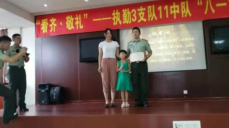 炊事班长王攀在部队服役16年,期间获得“武警部队标兵炊事员”、“总队优秀共产党员”、“总队优秀士官”等诸多荣誉,今天他的爱人李肖曼和女儿朵朵特意从老家赶过来为他颁奖。接过女儿给自己颁发的证书和奖章,王攀的内心感慨万千、激动不已,“这是我从军以来收到的最重要的荣誉!”王攀动情地说道。