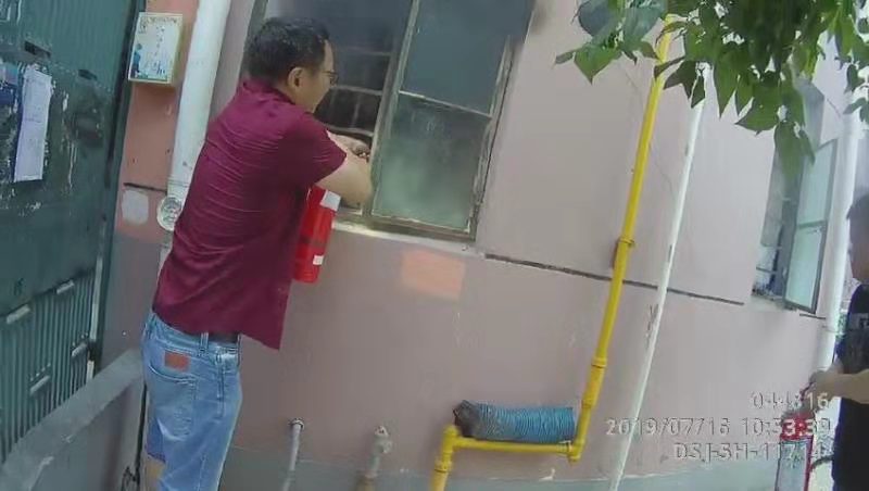 在多次尝试破门未果的情况下,为防止火势继续蔓延,顾警官立即指挥居委干部及物业工作人员使用灭火器从窗户的缝隙中向内灭火。消防队员到场时,明火已经基本被扑灭,但为了安全起见,顾警官指挥消防队员准备破窗入户,检查房屋内的情况。