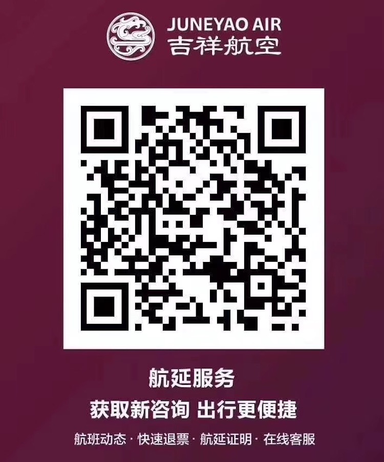 目前,吉祥航空已开通航班延误直通车服务,旅客扫描二维码可直接进行航班动态查询、快速退票、获取延误取消证明、转接在线客服等。