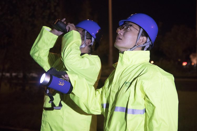 ▲8月10日凌晨1点时许,国网上海检修公司线路运维人员方思远、余快,对800千伏复奉线开展台风一级保电夜间巡视,仔细查看是否有大棚薄膜等易飘异物被大风吹至线路上。