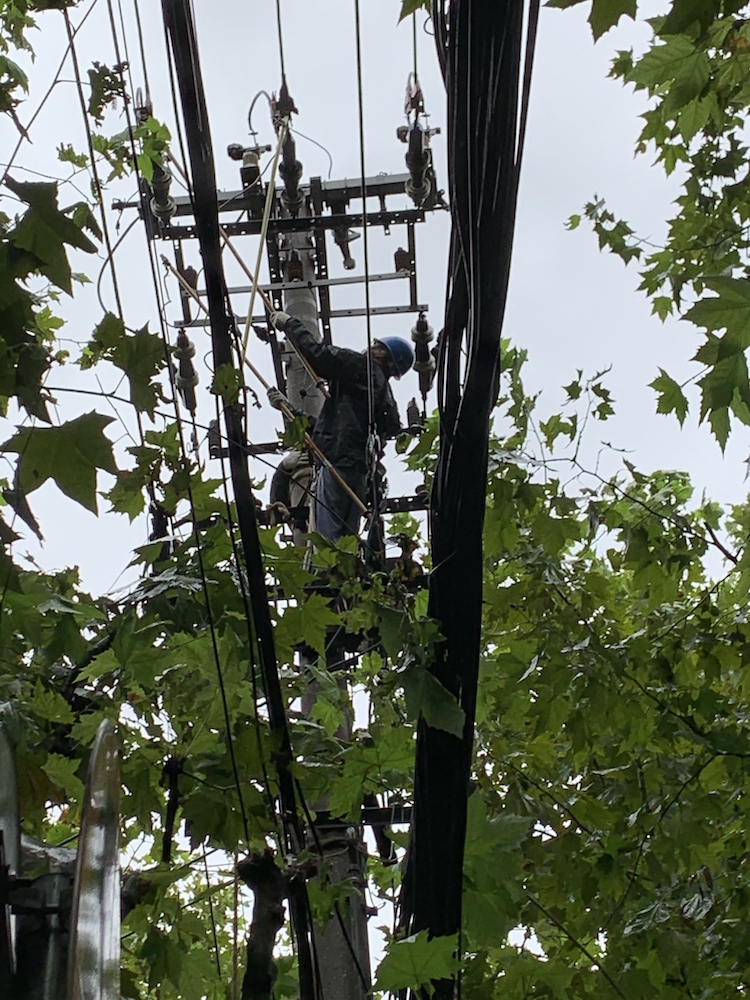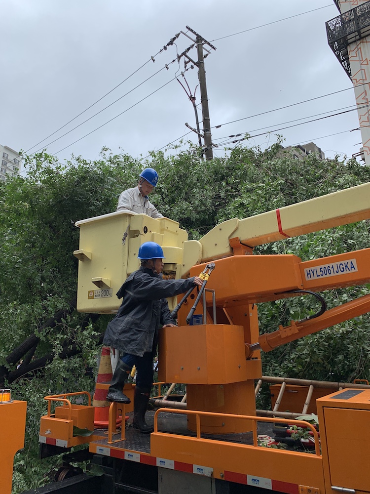 ▲8月10日凌晨5点许,徐汇区恭城路附近,大风刮断树枝导致一条10千伏线路断线故障,国网上海市南供电公司线路抢修人员及时隔离故障开展抢修,约7时许修复故障。