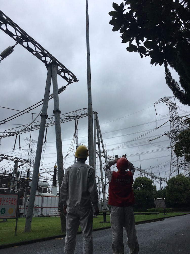▲8月10日11时,国网上海检修公司运行人员在500千伏黄渡变电站开展台风特巡,在大风中观察引线、避雷针等的晃动幅度,针对一个幅度大的避雷针,采用加强巡视,跟踪观察锈蚀及有无裂纹情况。