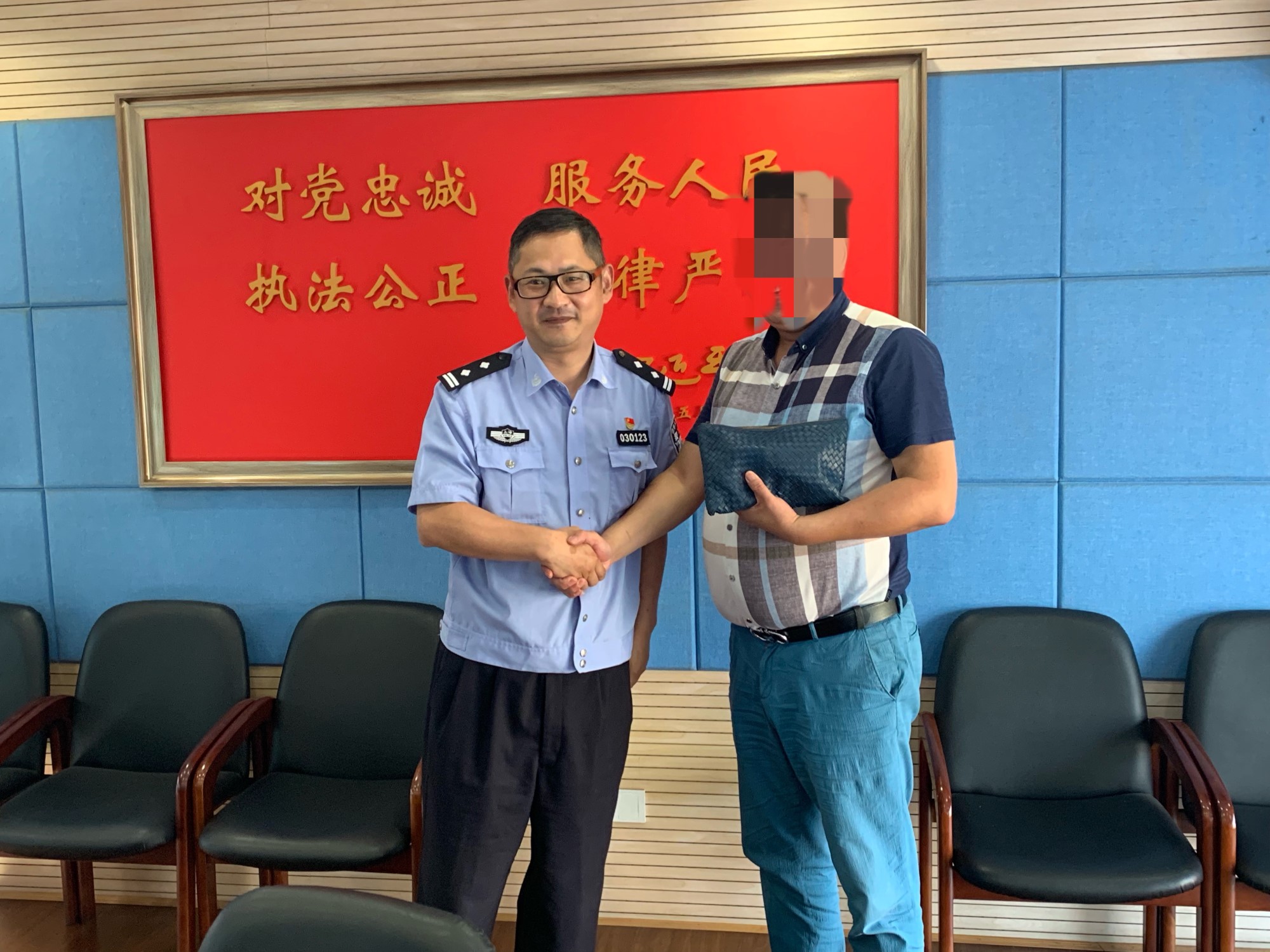 2019年8月12日下午,取回失物的市民郝先生紧紧握着普陀公安分局曹杨新村派出所所长王伟峰的手,连声道谢,“王警官,我现在太激动了,真没想到包还能找回来,我能和你合张影吗?”