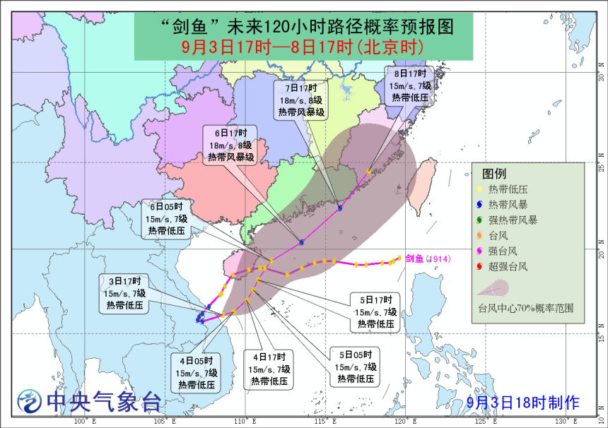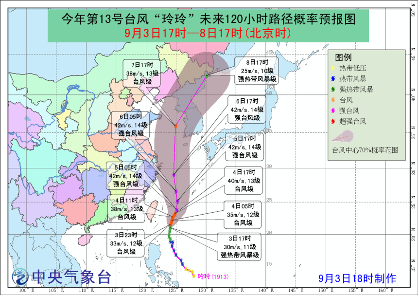 虽然已进入处暑节气,海上台风活动依然风起云涌——今年第13号台风“玲玲”3日早晨加强为强热带风暴级,17时其中心位于我国台湾省鹅銮鼻东偏南方约340公里的西北太平洋洋面上,预计“玲玲”将于4日晚上进入东海南部并继续向偏北方向移动,强度逐渐增强,最大强度可达台风级或强台风级。南海热带低压于3日凌晨2时加强为今年第14号台风“剑鱼”,并于2时30分前后以热带风暴在越南沿海登陆。预计“剑鱼”将向东偏北方向移动,4日上午到中午再次进入南海海域,强度缓慢增强,最大强度可达热带风暴级或强热带风暴级,预计7到8日将在我国华南沿海再次登陆。