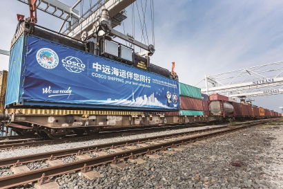 参加第二届进博会的捷克展品集装箱,成功吊装上由布拉格开往汉堡的火车。 (中远海运供图)