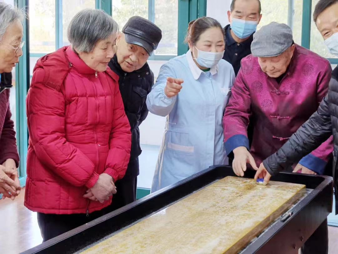 譬如安亭福利院新时代文明实践点,他们把“冰壶”运动搬上了桌面,玩起来既安全又乐趣不减——一张3米长的长方形大理石桌,就是“桌上冰壶”的场地。老人们站在桌边,瞄准桌面上的标壶,轻轻推掷手中壶,玩得不亦乐乎。据介绍,这种游戏原名“沙壶球”。壶型球在桌面和冰面上的滑动感和撞击感有相似之处,适合老年人提神醒脑。