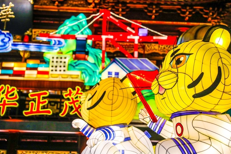 豫园商城中心广场高约9米的“虎跃东方”生肖灯组尤为壮丽。华宝楼墙面,一幅“千里江山图”徐徐展开,写就“百年恰是风华正茂”图卷,呼应巍峨的虎灯。“天官”携五仙在豫园为市民游客们送上浓浓中国味的吉祥祝福。非遗灯彩齐齐点亮,以“张灯”的形式,为游客提供赏灯纳福的美好氛围。