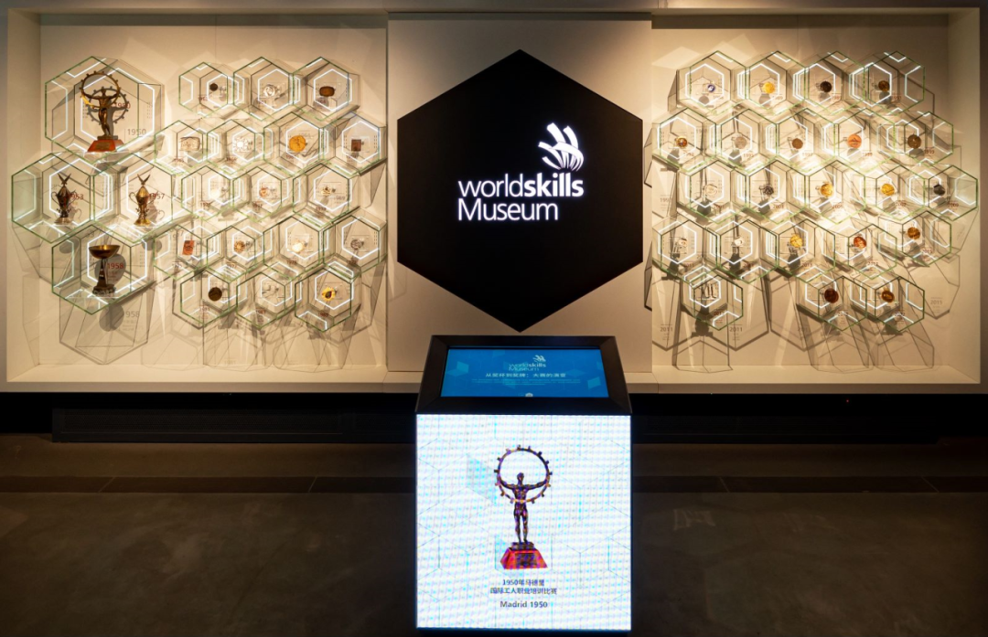 第二展区还展示了世界技能大赛的历届标志、奖牌、奖杯、纪念品……这些珍贵纪念,象征着荣誉和技能,传达着美好的寓意,也反映了比赛举办地区的文化。