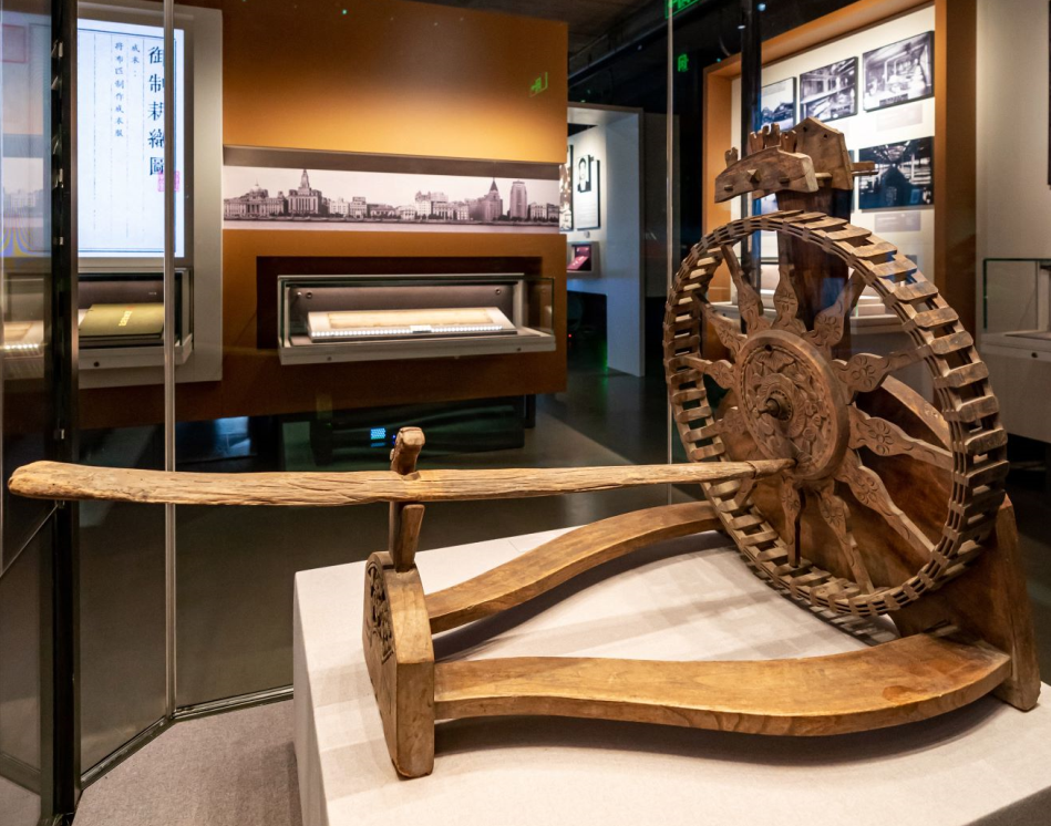 就在永安栈房建筑模型对面,还有一件第三展厅的重点展品三锭纺车(仿制品),是元初棉纺织专家黄道婆的发明。