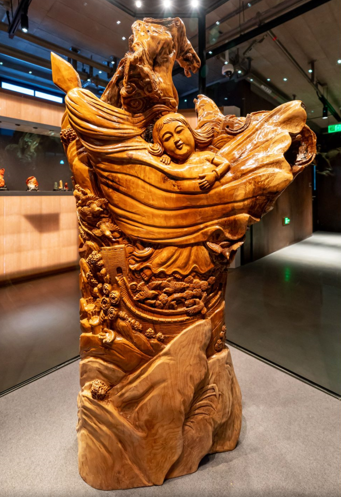 这一展区的收尾,是中国根艺大师吴先金先生历时300余天的精品力作《中国梦》。作品选取号称“帝王之木”的金丝楠木为原料,巨大的树根上,万里长城彰显东方神韵,五十六个民族共同托起中国梦;天真少女绚丽鲜花,展现祖国欣欣向荣未来充满希望;和平鸽放飞和平向往,象征强大的中国拥抱世界;整件作品传递出中华大地蓬勃向上的精气神,拥抱世界拥抱明天的民族自信和自豪。