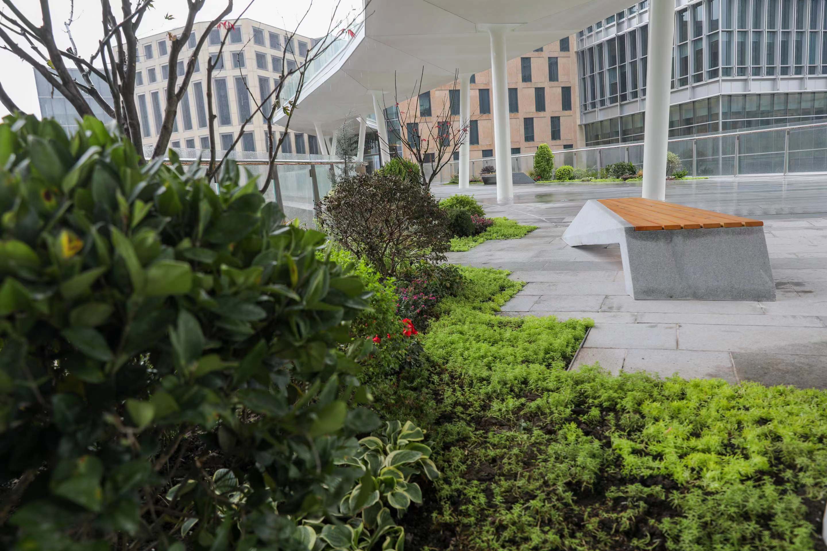 “连廊示范段就像是游走于建筑丛林与城市森林间的艺术飘带,既要从外观上兼顾周边建筑风格,又要从功能上做好衔接。”北外滩集团连廊项目相关负责人表示,以示范段二期项目为例,选择建设双层连廊主要考虑到北外滩来福士广场二楼与三楼均为商场,友邦金融中心二楼为大剧院入口、三楼为平台,都起到公共服务功能,建设双层连廊将更方便人们出行,也更好地分流人群。考虑到两侧都是高层建筑,在三层桥体桥面上密布了200余颗小灯,通过编程设计,在夜间形成律动的“北外滩星河”效果。在设计上,考虑到北外滩来福士外观使用了米色大理石,因此连廊的色彩在示范段一期项目的选色中加入暖色调,使连廊彼此之间有延续,又具备在地性。而另一端友邦金融中心的接口,则采用了与建筑外墙统一的灰色系立柱作为收尾,与既有建筑融为一体。二层桥体还预留了0.4米的覆土区,可以在两侧同步种植草木、灌木、乔木形成多个绿植四季花境。在选材上,植被常绿,花种则选择花期约半年的品种,美观与环保并举。同时,结合友邦金融中心三层绿化平台栽种的樱花树,在接口处的“微花园”也种植樱花树,在视觉上形成整体。此外,还设置了休憩座凳,进一步优化步行体验感。