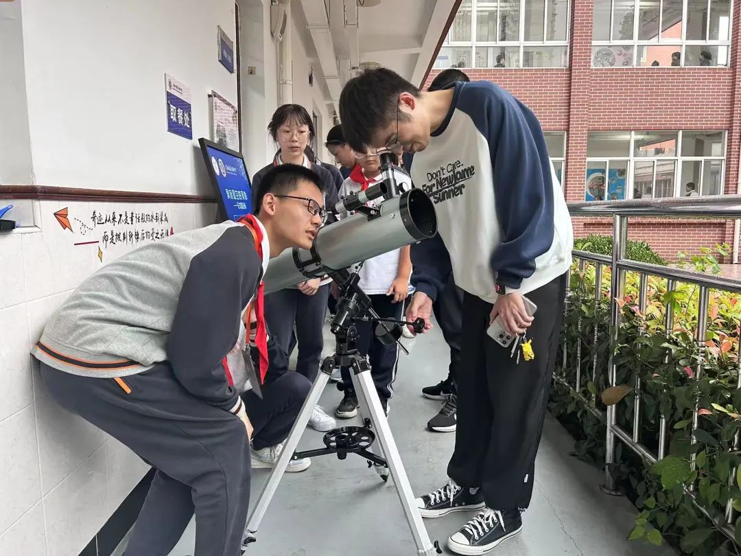 随着下课铃声响起,游园会正式开启。“走廊里架起了天文望远镜!”同学们围着物理陈老师,看他如何调试天文望远镜。“因为天气关系,我们只能看远方的建筑,这样调节之后建筑上面有一些字就能够看得很清楚。”陈老师说自己也还在摸索学习,“我们请了外面专业的老师过来教授我们,然后我们再教授给学生,学校里热爱天文的孩子很多。”
