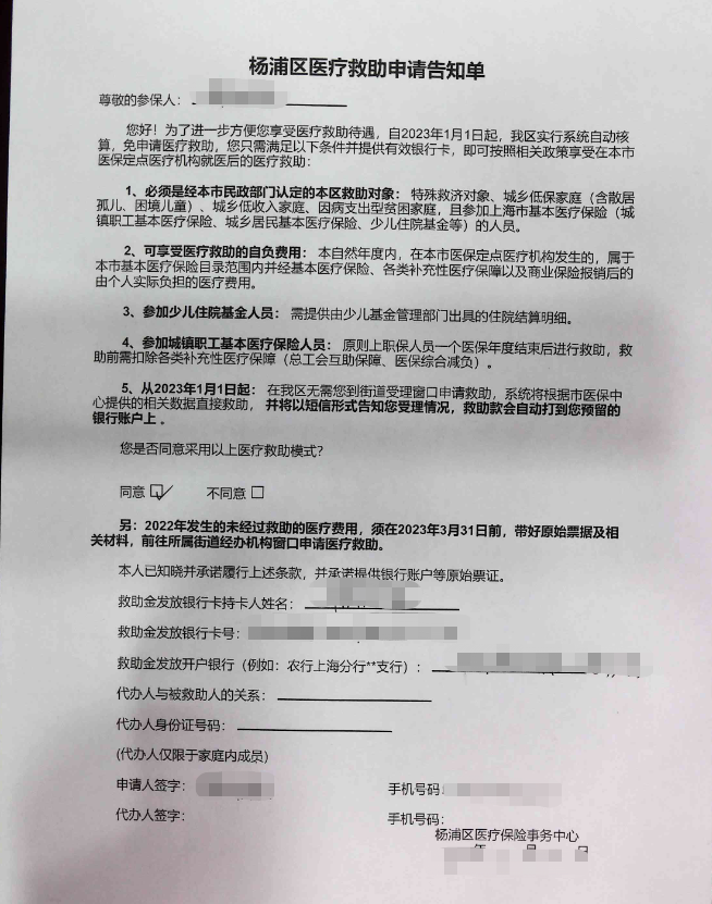 徐某是一位身患尿毒症十多年的低保人员,家中还有肢体残疾的妻子及尚在读书的女儿。以往每两个月,他的医疗救助的流程是:去保险公司送居保大病材料、去保险公司拿居保大病结算单、去社区事务受理服务中心送居保大病结算单及医疗发票等。每次来回都要辗转三个多小时,对于他羸弱的身体是个很大的考验。2022年底,徐某从居委会得知医疗救助“免申即享”平台将上线,于是他在2022年11月8日签署了医疗救助申请告知书及承诺书。