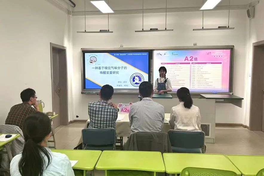 “每天早上被闹钟吵醒都不是一件让人开心的事,还会影响一天的心情,我就联想到了早上被妈妈做的早饭香味唤醒是多么幸福。”上海市存志学校初三学生陈远鸿因此想到通过气味来唤醒起床,她在现场展示的作品是“一种基于嗅觉气味分子的唤醒装置研究”。