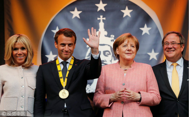 5月9日,德国亚琛,默克尔为马克龙颁发用以表彰为欧盟一体化作出杰出贡献的“查理曼奖”。视觉中国