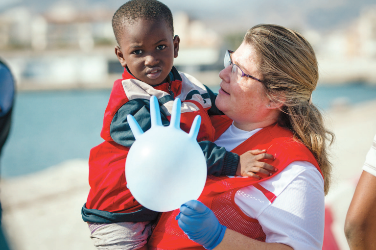 ▲地中海获救移民抵达西班牙莫特里尔港,西班牙红十字会工作人员抱起了其中一名儿童(视觉中国)
