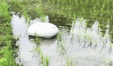 Aigamo 底盘大小约60平方厘米,重1.5kg,可以借助WiFi和GPS漂游于稻田的水面上,能自动驾驶,完全防水,看上去有点像萌版扫地机器人。