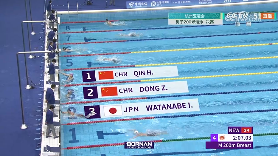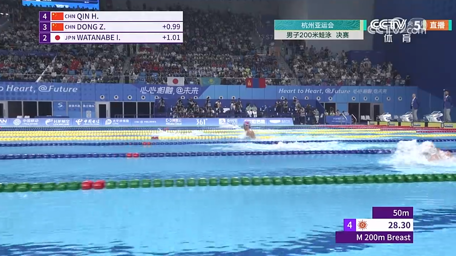9月28日,杭州第19届亚运会游泳男子200米蛙泳决赛,中国选手覃海洋夺得金牌并打破赛会纪录。中国选手董志豪获得银牌。