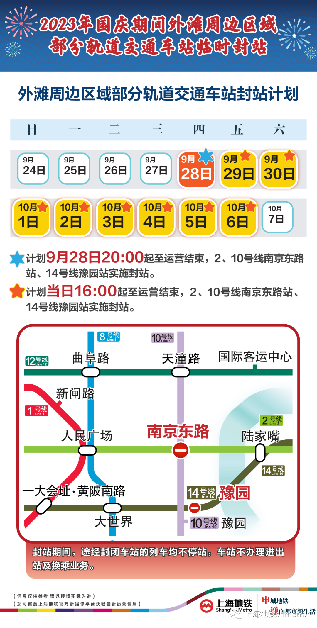 申通地铁集团提示,9月29日至10月6日,每日16:00起至运营结束,地铁2、10号线南京东路站,14号线豫园站将计划实施封站跳停。封站时段内,在2、10号线南京东路站,14号线豫园站不能上下车,地铁站出入口也将同步关闭,乘客不能进出车站。届时,车站将加强站内广播宣传、导向设置、站台站厅秩序维护等工作。