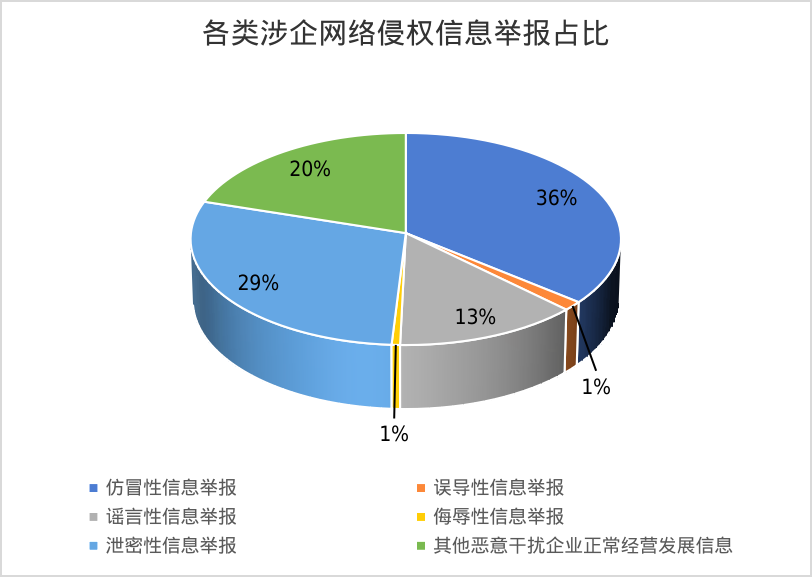 自专区建立以来,上海属地网站平台受理处置涉企举报信息数量持续攀升,其中,仿冒性、泄密性和其他恶意干扰企业正常经营发展信息举报量占比最高,分别为36%、29%、20%;泄密性、误导性、谣言性和其他类信息举报有效处置率达到80%以上。