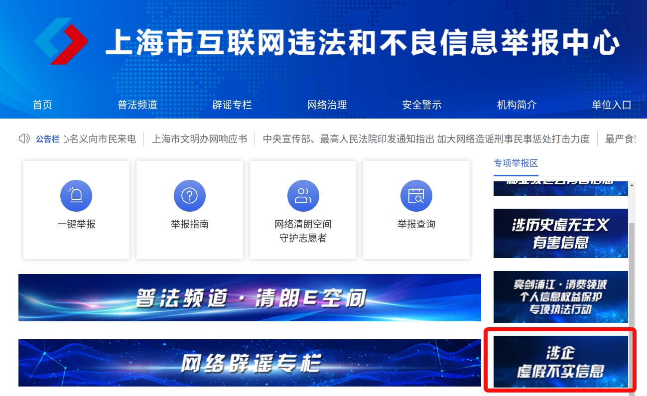 为深入贯彻落实全国网络举报工作会议精神,进一步优化提升上海涉企网络侵权举报工作水平,今年6月以来,市委网信办全力推进属地网站平台“线上涉企虚假不实信息举报专区”(以下简称“涉企举报专区”)建设工作,第一时间在上海举报中心官网首页首屏显著位置开辟“涉企举报专区”栏目,指导哔哩哔哩、小红书、东方财富网等20家属地重点网站平台成功上线“涉企举报专区”,推动线上涉企举报受理处置提质增效。