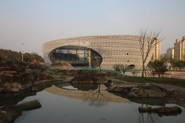 除此之外,场馆的造型很“江南”,令人过目不忘。陈月芳介绍,攀岩馆外形就像一个巨大的镂空的蚕茧,由超高性能混凝土编织成曲折的“蚕丝”,像拼图一样拼接而成,远看有纺织面料的灵动飘逸,近看是运动员攀岩而上的美学线条,这个设计理念源于江南水乡的丝绸文化符号,传达了杭州亚运会的地域特色,也体现了绍兴柯桥作为中国轻纺城的产业特点,蕴含着攀岩运动员破茧而出的美好祝愿。晚上,五彩灯光透过镂空的蚕丝,就像蚕茧在微微发光,美轮美奂。场馆也获评了杭州亚运会十大特色场馆之唯一的建筑特色奖。