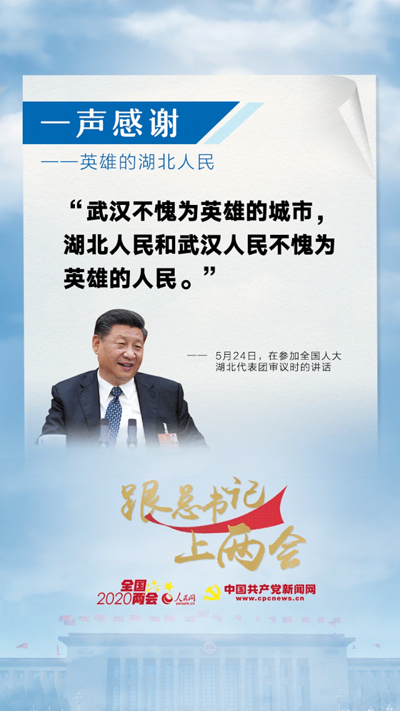 5月24日,面对湖北代表团的代表们,他又一次强调:“武汉不愧为英雄的城市,湖北人民和武汉人民不愧为英雄的人民。我向在座各位、向湖北各族干部群众致以诚挚的问候和衷心的感谢。”