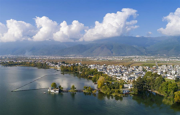 2020年11月9日,无人机拍摄的云南大理的苍山洱海间的村落。(新华社发)