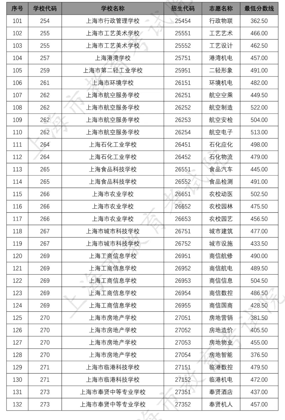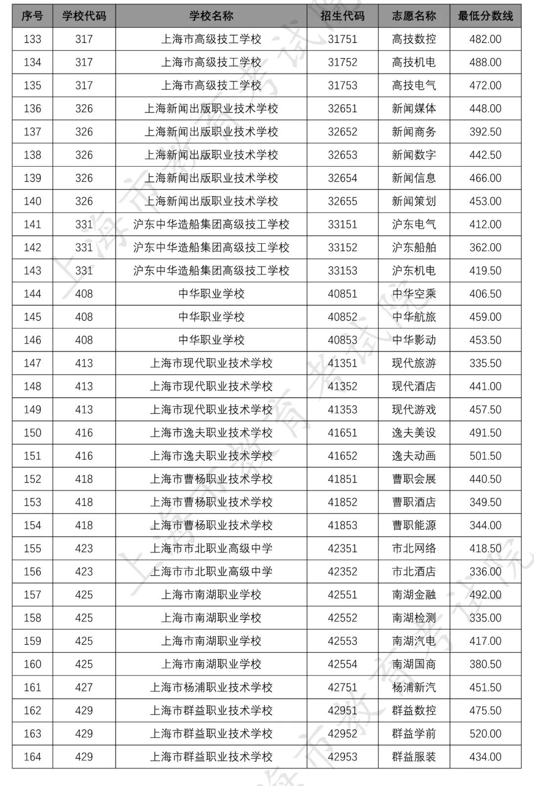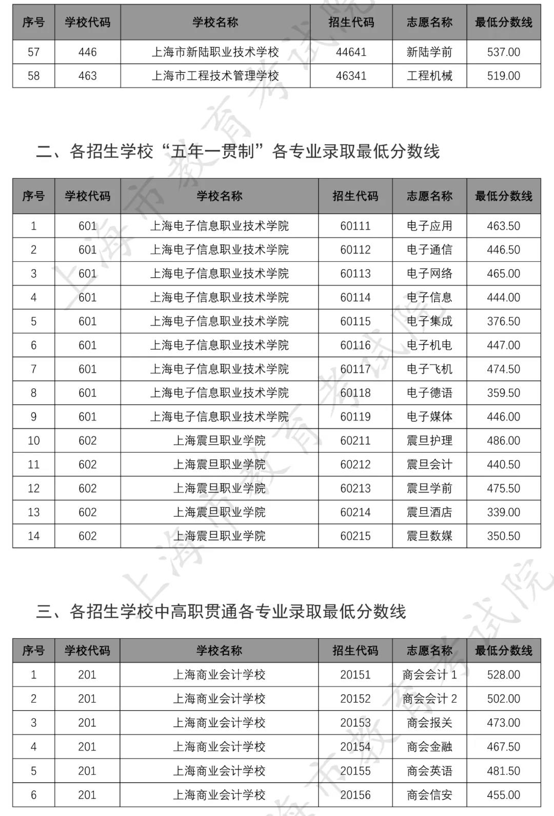 据上海市教育考试院官网,2020年上海市中等职业学校提前批招生中本贯通、“五年一贯制”和中高职贯通各专业录取最低分数线经审定公布如下↓