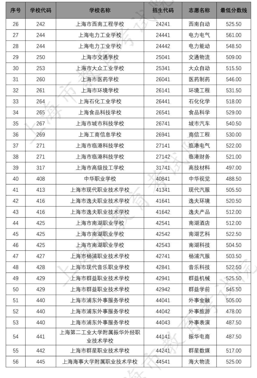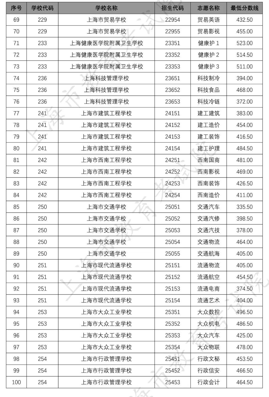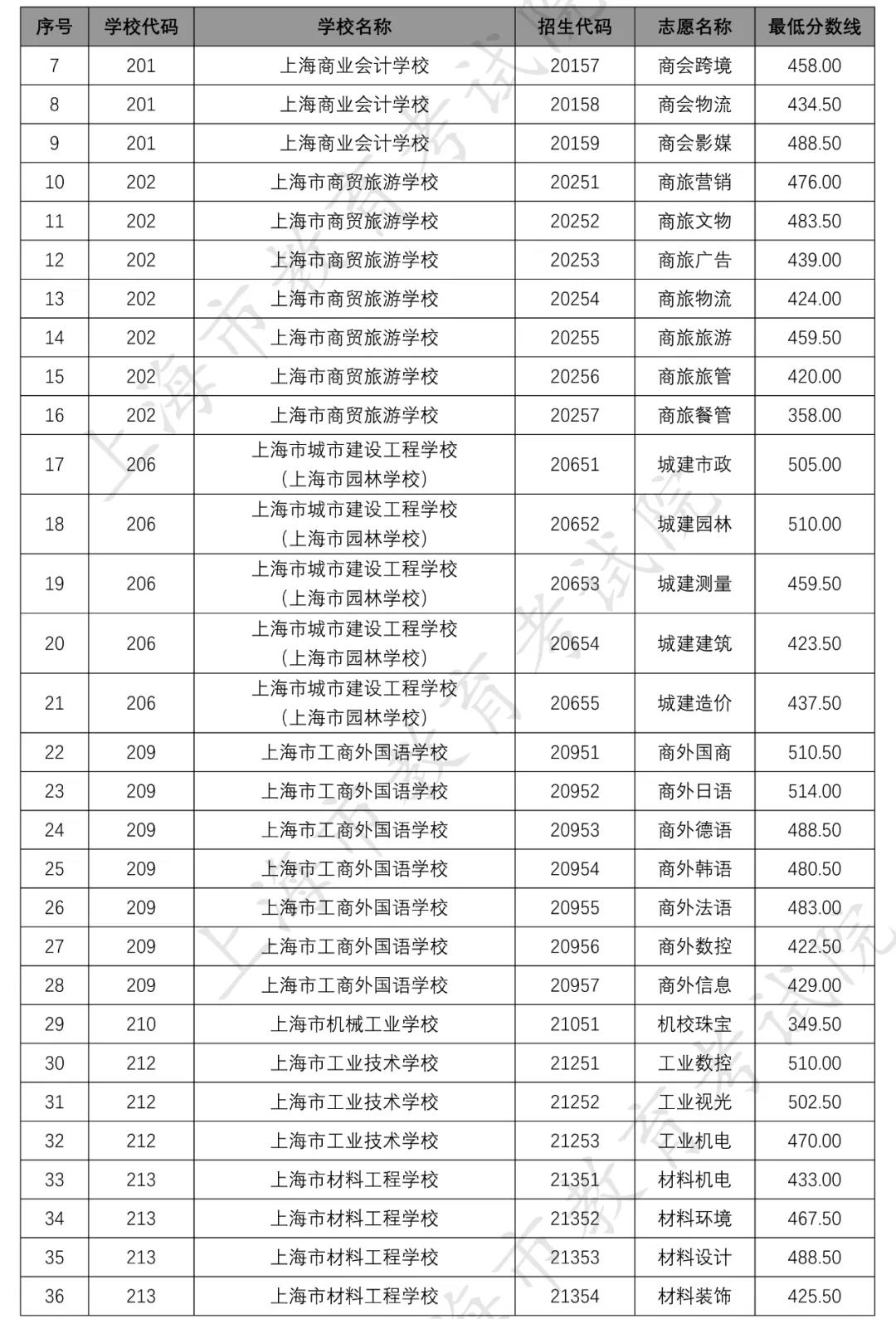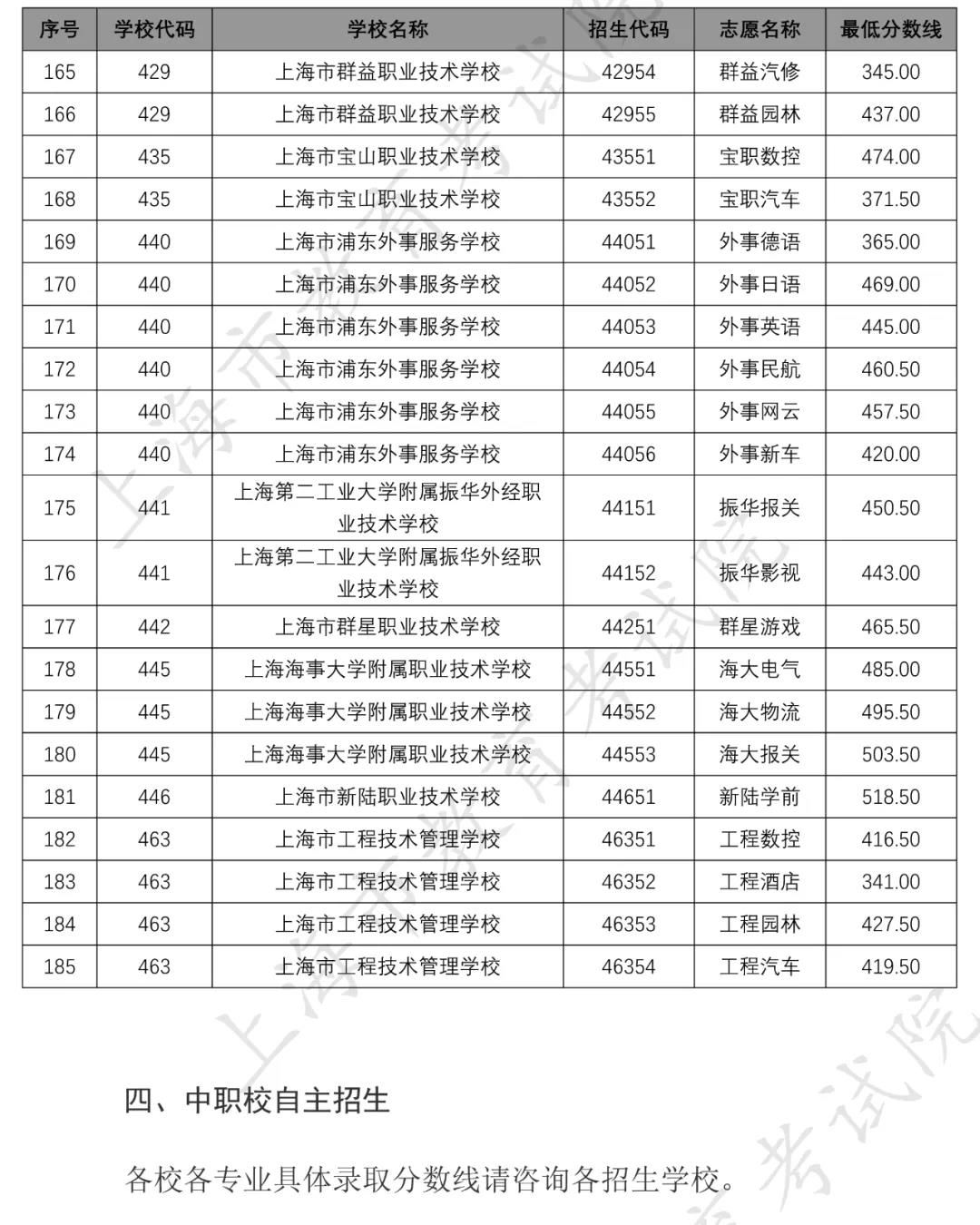 据上海市教育考试院官网,2020年上海市中等职业学校提前批招生中本贯通、“五年一贯制”和中高职贯通各专业录取最低分数线经审定公布如下↓