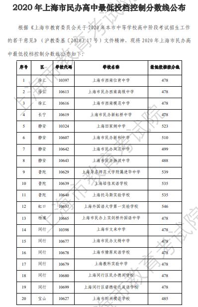 据上海市教育考试院官网,今天,2020年上海市民办高中最低投档控制分数线公布,具体如下: