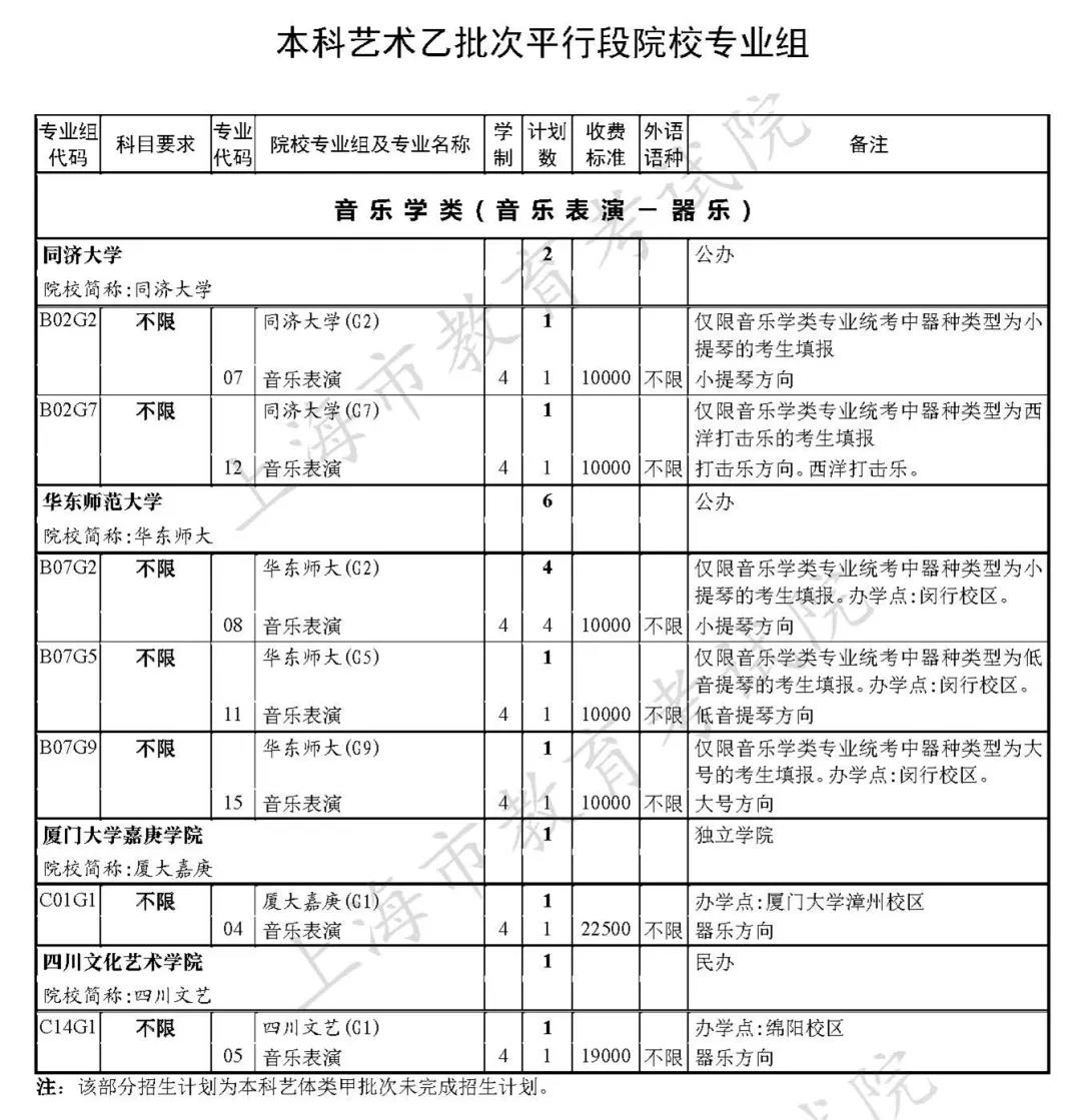 2.填报乙批次平行段志愿时,各院校专业组均设有相应市统考专业类别要求。考生应根据自身实际情况,选填对应专业类别要求的院校专业组;考生可以选择与甲批次平行段不同的市统考专业类别进行填报,但只可选择一种专业类别填报平行段志愿;想要填报“音乐表演—器乐”志愿的考生还须重点关注所要填报专业对器种的要求,不要填报与自身器种不符的院校专业组(专业);为避免退档风险,建议在填报平行段志愿时尽量选择服从专业调剂。