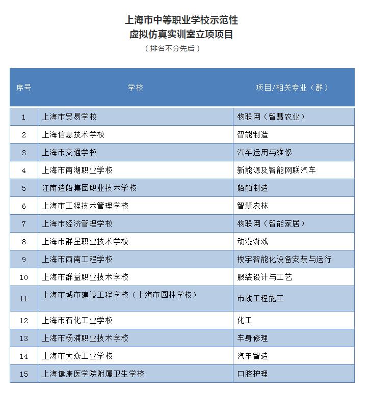 根据相关要求,经学校申报、专家评议,结合本市经济社会发展战略和产业发展需求,上海市教委研究确定15个创建项目为上海市中等职业学校示范性虚拟仿真实训室立项项目,具体名单详见↓