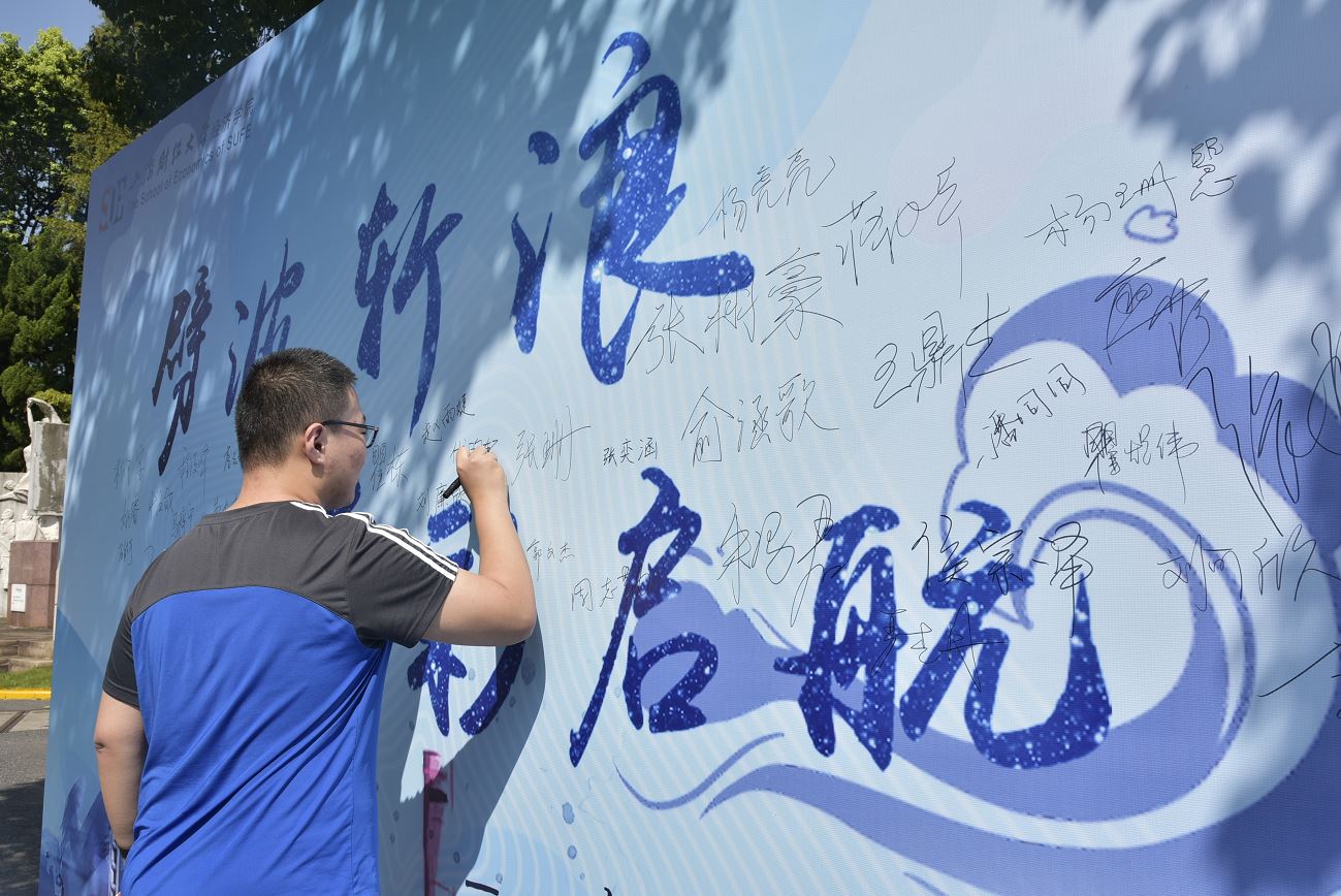 在经济学院,每名新生在签名版上留下了自己的名字,开启“劈波斩浪,经彩启航”的大学生活。