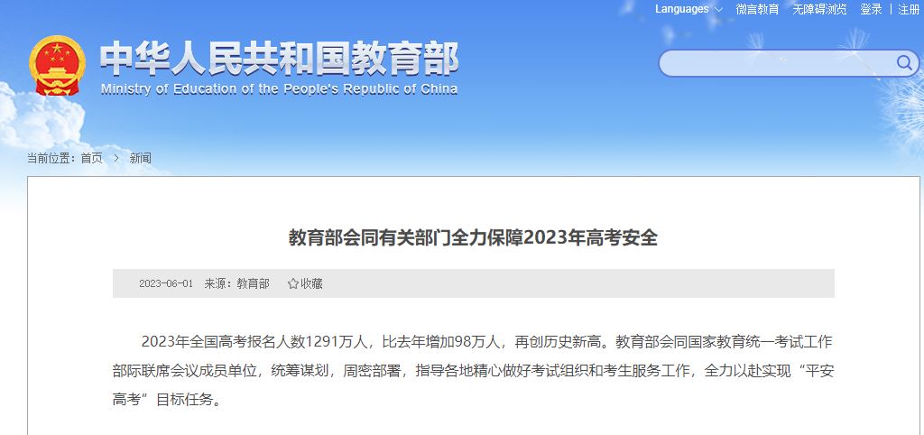 2023年全国高考报名人数1291万人,比去年增加98万人,再创历史新高。教育部会同国家教育统一考试工作部际联席会议成员单位,统筹谋划,周密部署,指导各地精心做好考试组织和考生服务工作,全力以赴实现“平安高考”目标任务。