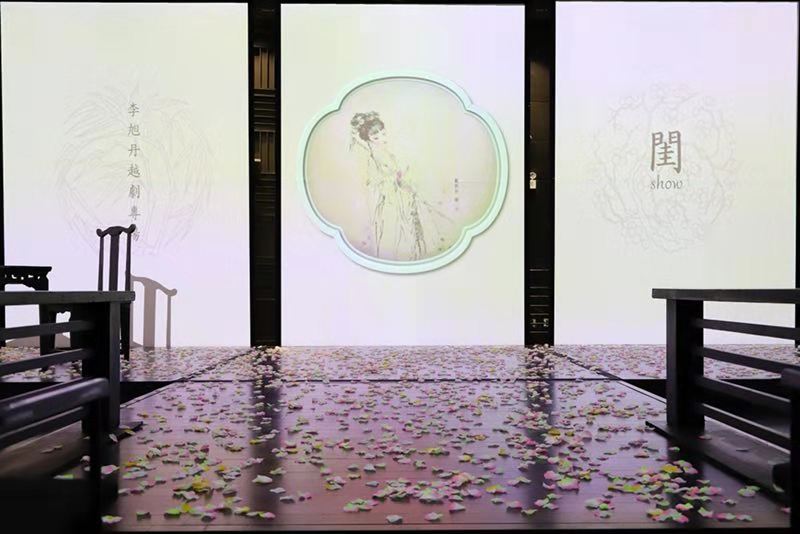 演出现场,三面环绕的落地投影营造出淡雅悠远的意境。居中的黛玉葬花图是著名画家戴敦邦专为这场演出所特别绘就的。